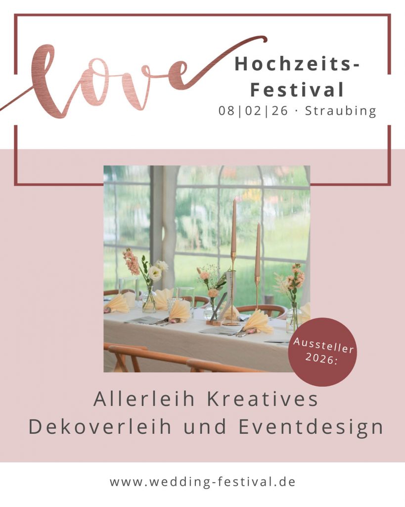 Rund 50 kreative und hochprofessionelle Unternehmen aus ganz Ost- & Oberbayern werden an diesem Hochzeits-Event teilnehmen. Somit ist die „love. Straubing“ eine der größten Hochzeitsmessen in ganz Ostbayern.